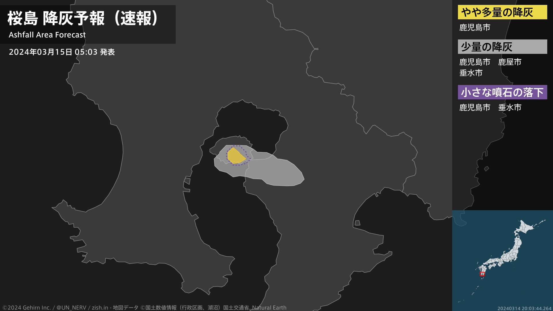 【桜島 降灰予報(速報)】1時間以内に鹿児島市(桜島)ではやや多量の降灰があり、降灰は鹿児島県鹿屋市まで予想されます。また、火口から南東方向およそ4kmまでの範囲では、小さな噴石が風に流されて降るおそれがあります。#降灰予報(速報)