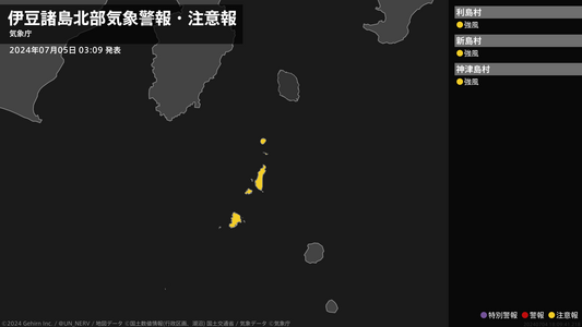 【東京都 気象警報・注意報 2024年07月05日 03:09】伊豆諸島北部、伊豆諸島南部では、5日夕方まで強風に注意してください。伊豆諸島南部では、5日夕方まで濃霧による視程障害に注意してください。#気象警報注意報 #東京都