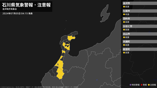 【石川県 気象警報・注意報 2024年07月05日 04:15】石川県では、高潮に注意してください。#気象警報注意報 #石川県