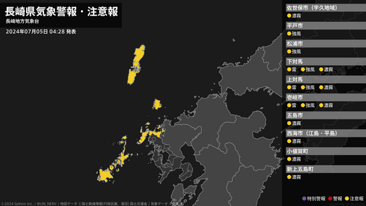 【長崎県 気象警報・注意報 2024年07月05日 04:28】北部、壱岐・対馬では、強風に注意してください。壱岐・対馬では、急な強い雨や落雷に注意してください。壱岐・対馬、五島では、濃霧による視程障害に注意してください。#気象警報注意報 #長崎県