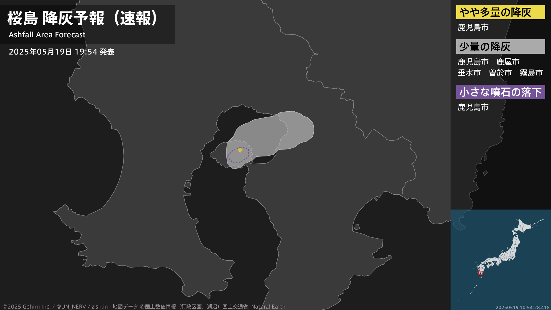 【桜島 噴火に関する火山観測報 2025年05月19日 19:31】19日 19時25分頃、桜島(南岳山頂火口)で噴火がありました。噴煙高度は火口上1800m、噴煙の流向は東です。#火山 #鹿児島県(奄美地方除く)