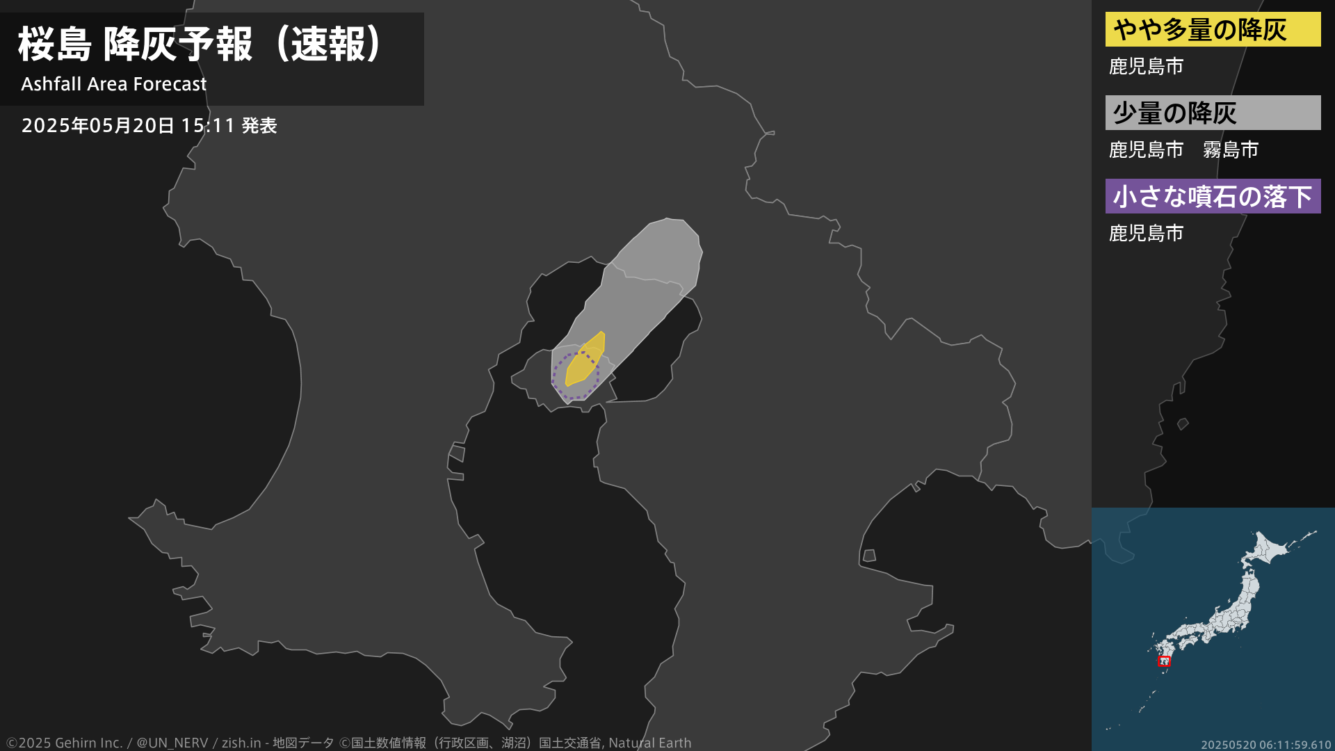 【桜島 降灰予報(速報)】1時間以内に鹿児島市(桜島)ではやや多量の降灰があり、降灰は鹿児島県霧島市まで予想されます。また、火口から北東方向およそ3kmまでの範囲では、小さな噴石が風に流されて降るおそれがあります。#降灰予報(速報)