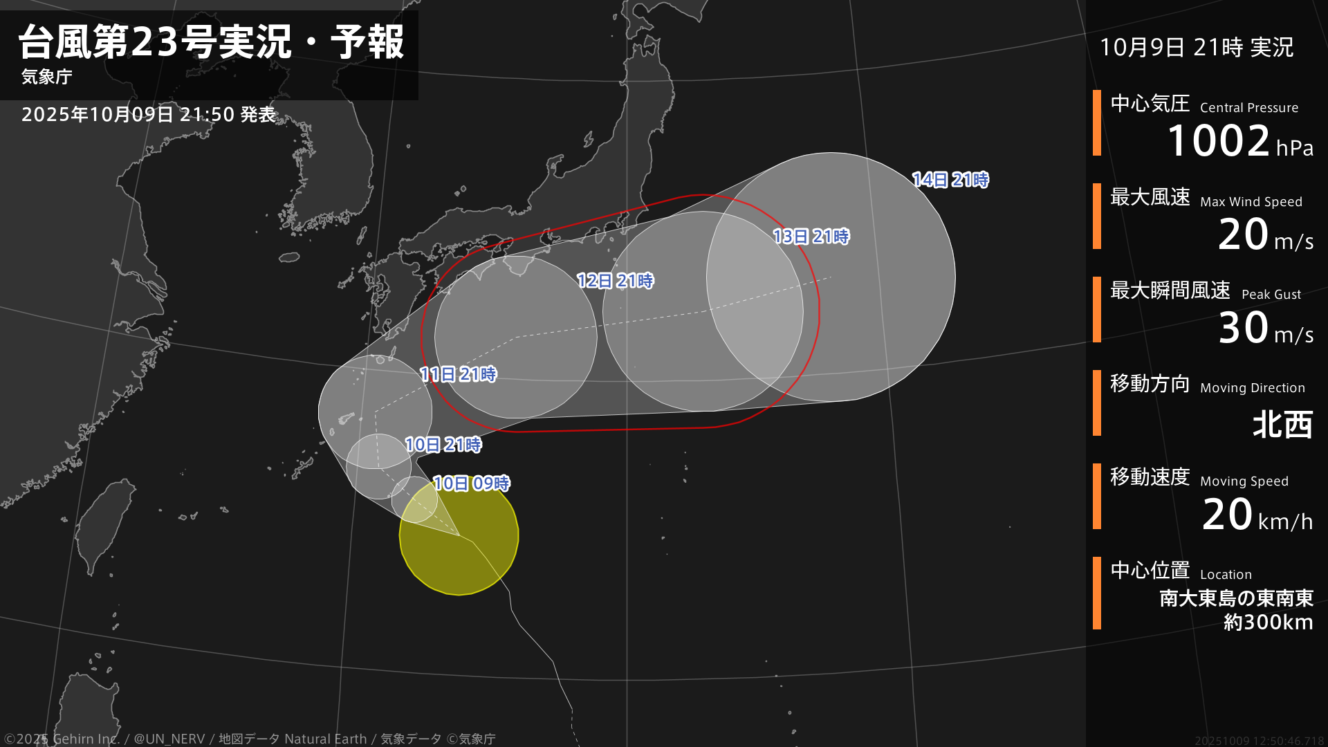 【台風第23号実況・予報 2025年10月09日 21:50】台風第23号(ナクリー)は、南大東島の東南東約300kmを1時間に20キロの速さで北西に進んでいます。#台風情報
