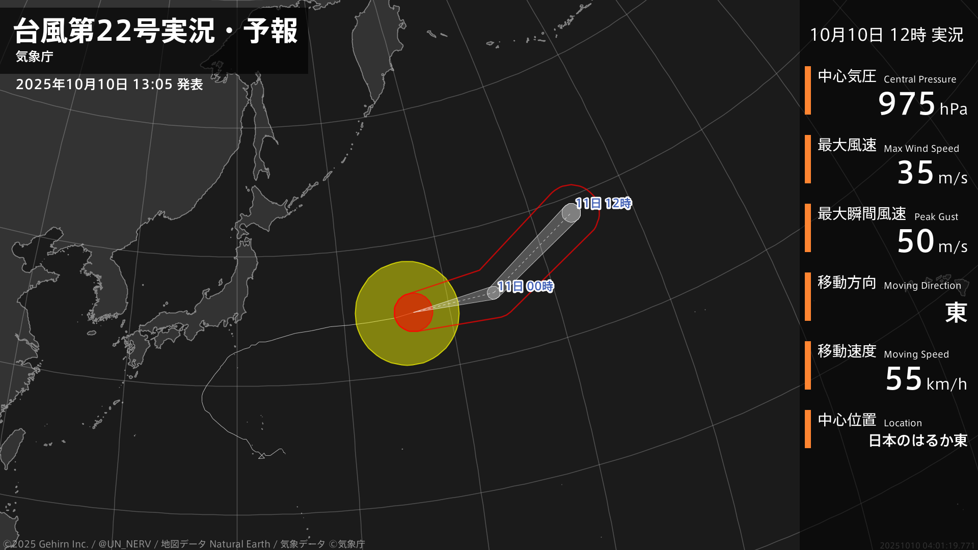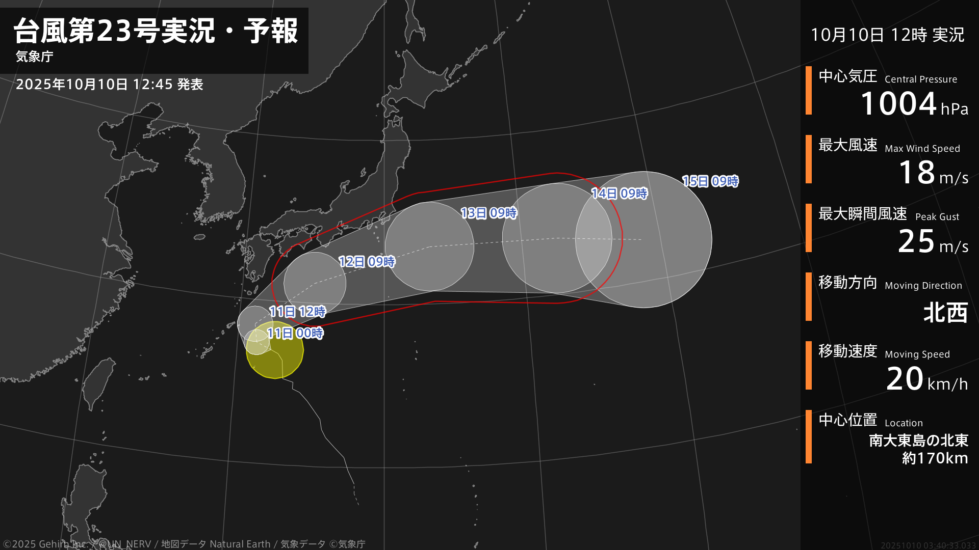 台風第23号は、12日から13日頃にかけて、伊豆諸島に接近するおそれがあります。伊豆諸島では、暴風に厳重に警戒してください。また、うねりを伴う高波、土砂災害、低い土地の浸水、河川の増水や氾濫に警戒してください。