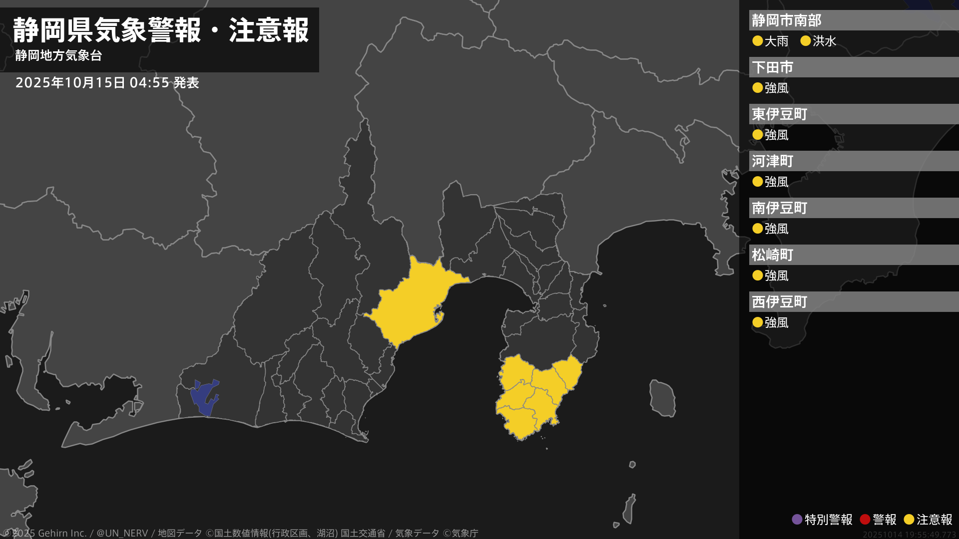 【静岡県 気象警報・注意報 2025年10月15日 04:55】