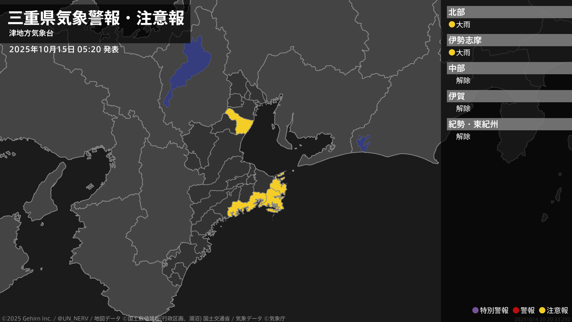 【三重県 気象警報・注意報 2025年10月15日 05:20】