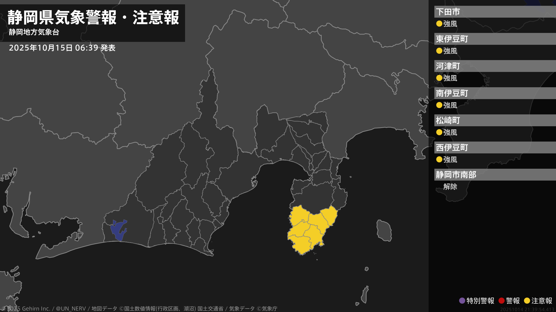 【静岡県 気象警報・注意報 2025年10月15日 06:39】
