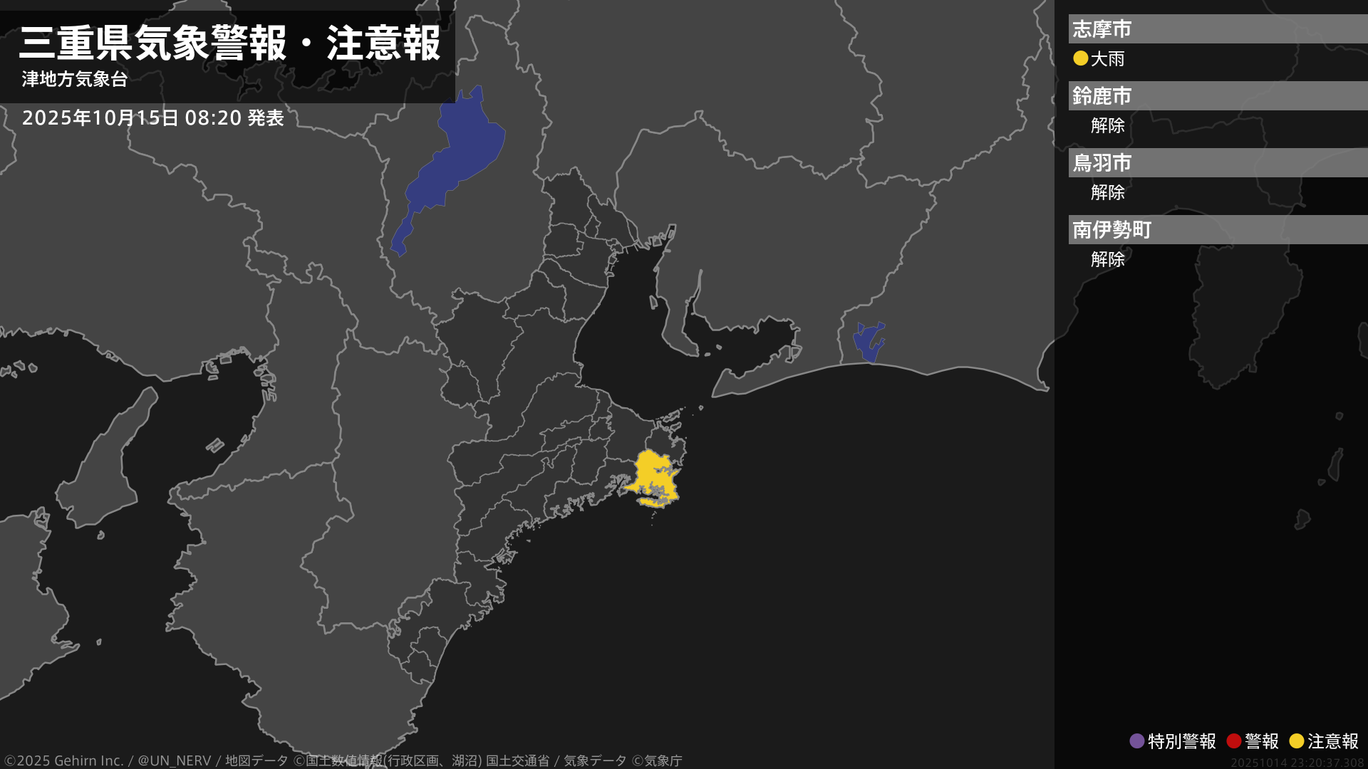 【三重県 気象警報・注意報 2025年10月15日 08:20】