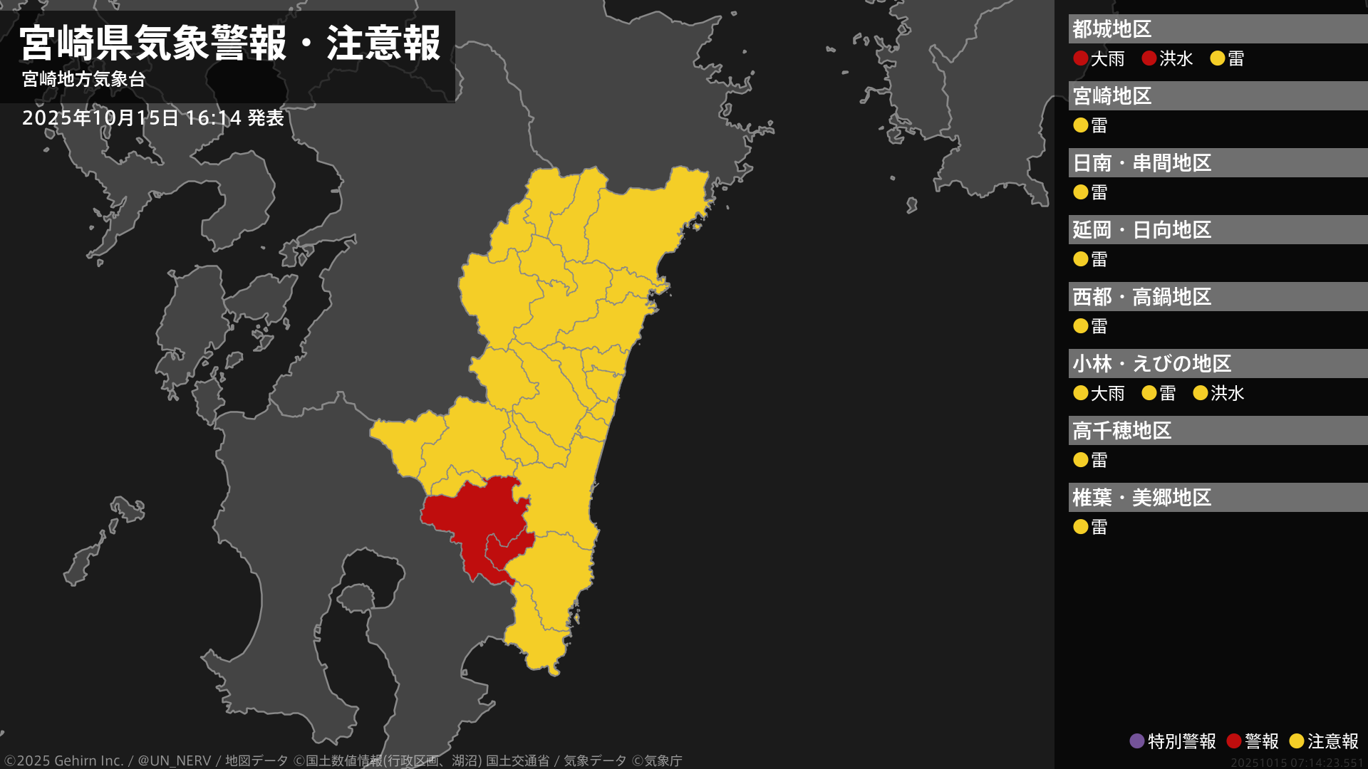 【宮崎県 気象警報・注意報 2025年10月15日 16:14】南部山沿いでは、15日夜のはじめ頃まで低い土地の浸水や河川の増水に警戒してください。#気象警報注意報 #宮崎県