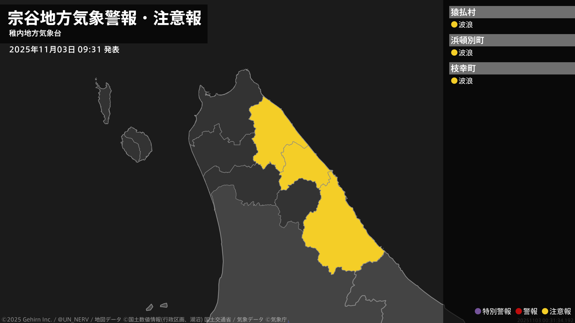 【宗谷地方 気象警報・注意報 2025年11月03日 09:31】宗谷地方では、3日夕方まで高波に注意してください。#気象警報注意報 #宗谷地方