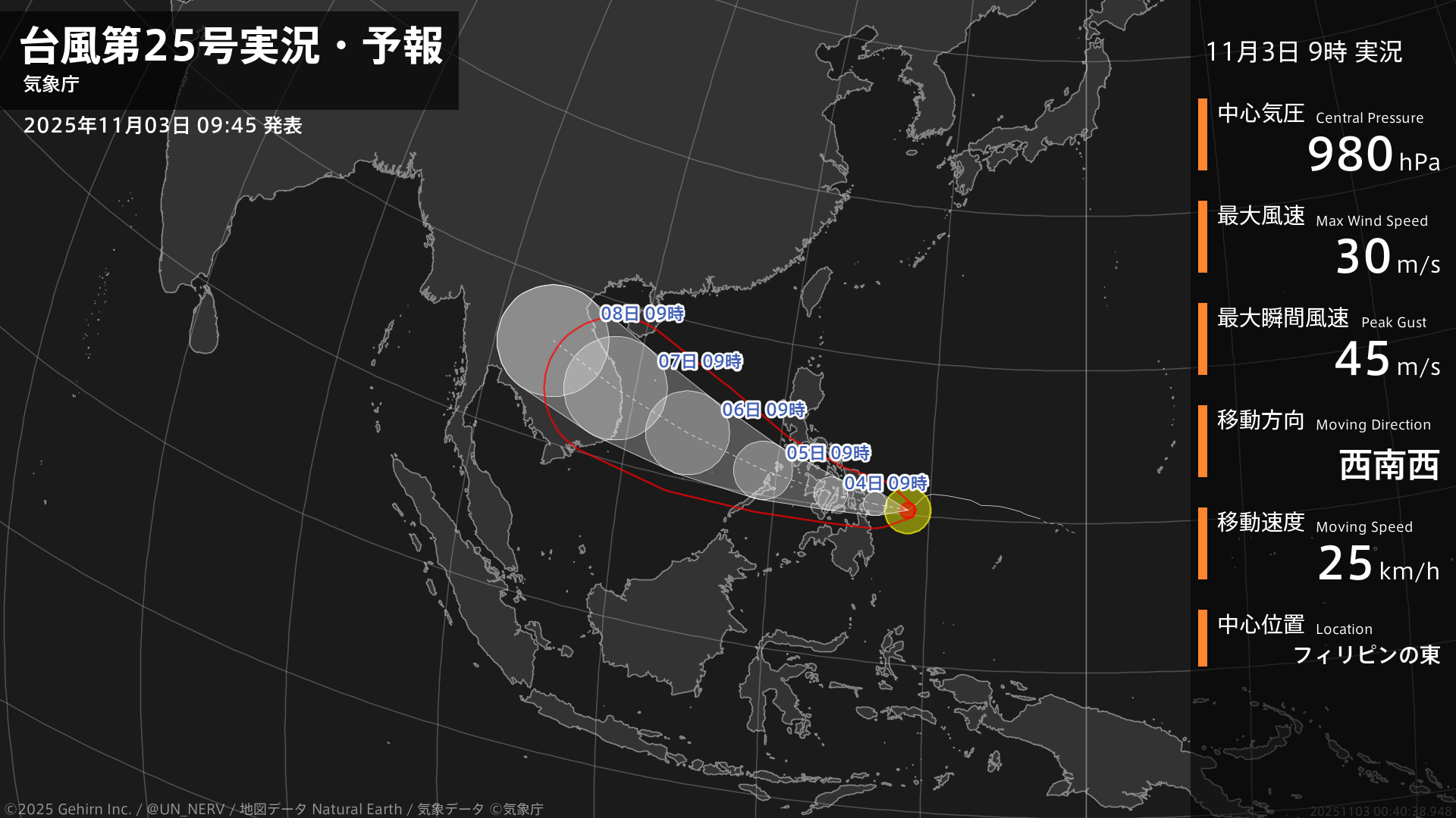 【台風第25号実況・予報 2025年11月03日 09:40】台風第25号(カルマエギ)は、フィリピンの東を1時間に25キロの速さで西南西に進んでいます。#台風情報