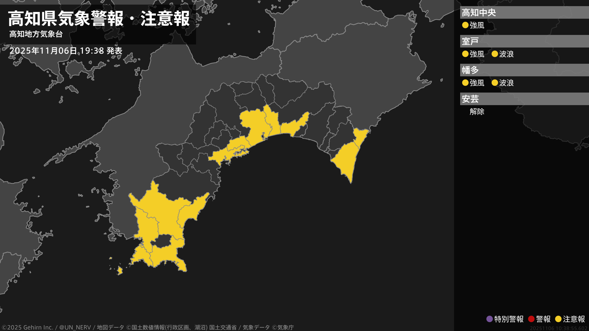 【高知県 気象警報・注意報 2025年11月06日 19:38】中部、西部では6日夜遅くまで、東部では7日昼前まで、強風に注意してください。西部では6日夜遅くまで、東部では7日昼前まで、高波に注意してください。#気象警報注意報 #高知県