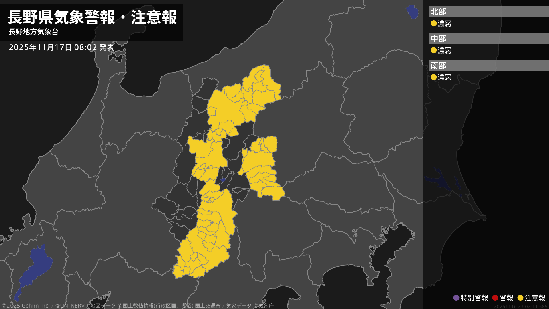 【長野県 気象警報・注意報 2025年11月17日 08:02】長野県では、17日昼前まで濃霧による視程障害に注意してください。#気象警報注意報 #長野県