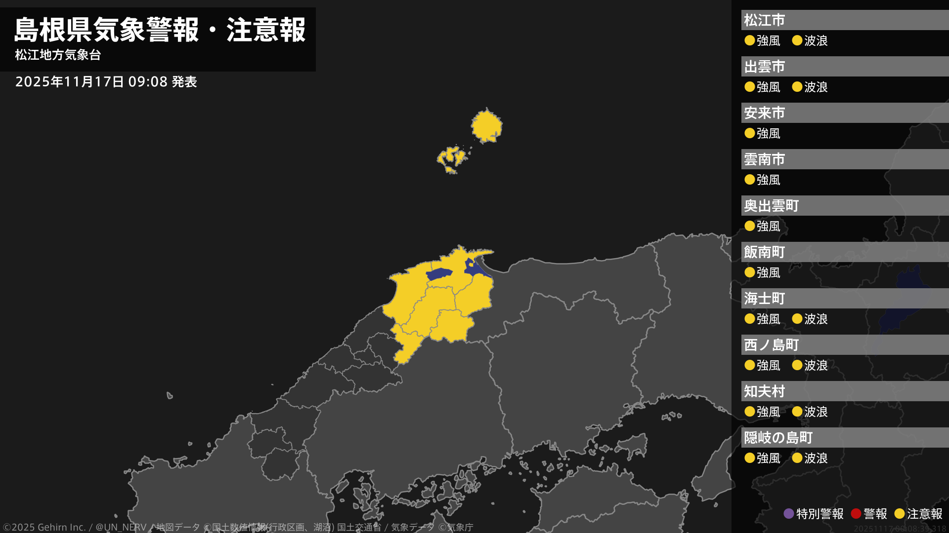 【島根県 気象警報・注意報 2025年11月17日 09:08】東部、隠岐では、強風や高波に注意してください。#気象警報注意報 #島根県
