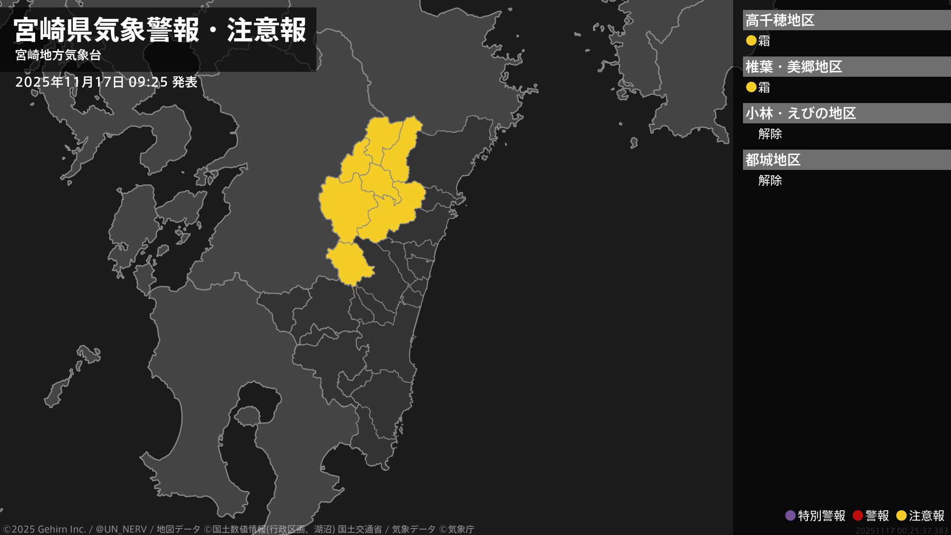 【宮崎県 気象警報・注意報 2025年11月17日 09:25】北部山沿いでは、18日朝は霜に対する農作物の管理に注意してください。#気象警報注意報 #宮崎県