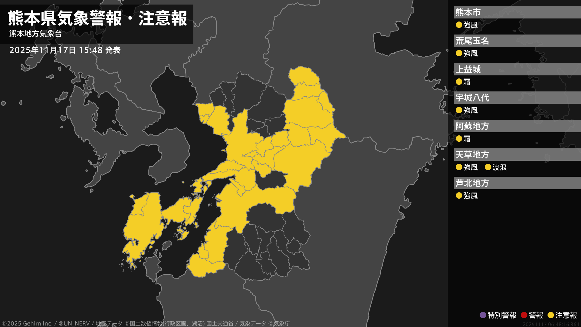 【熊本県 気象警報・注意報 2025年11月17日 15:48】