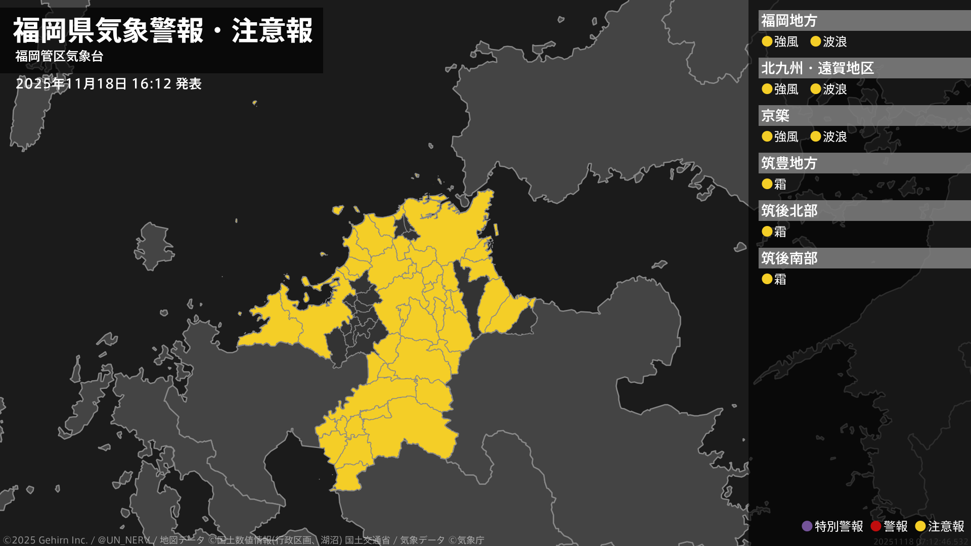 【福岡県 気象警報・注意報 2025年11月18日 16:12】福岡、北九州地方では、18日夜のはじめ頃まで強風に、19日明け方まで高波に注意してください。筑豊、筑後地方では、19日朝は霜に対する農作物の管理に注意してください。#気象警報注意報 #福岡県