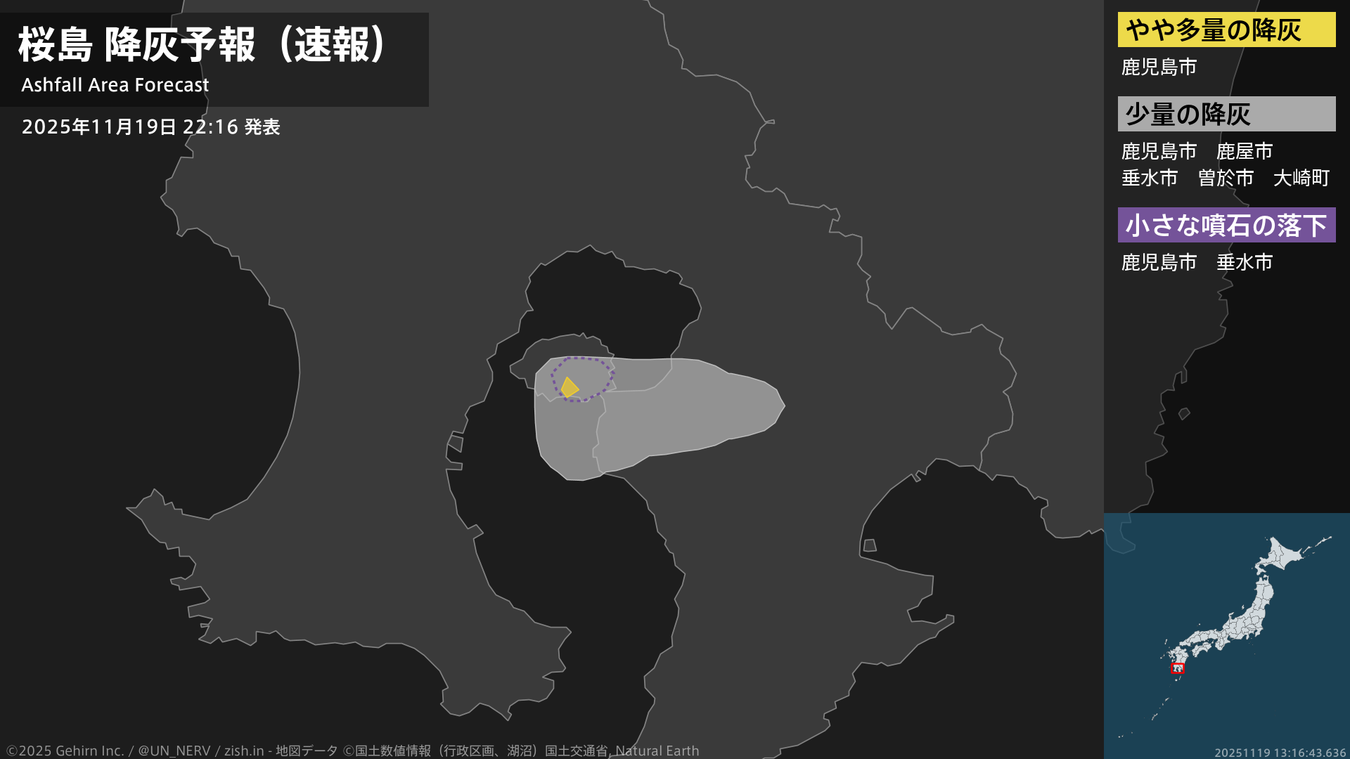 1時間以内に鹿児島市(桜島)ではやや多量の降灰があり、降灰は鹿児島県曽於市まで予想されます。また、火口から東方向およそ4kmまでの範囲では、小さな噴石が風に流されて降るおそれがあります。