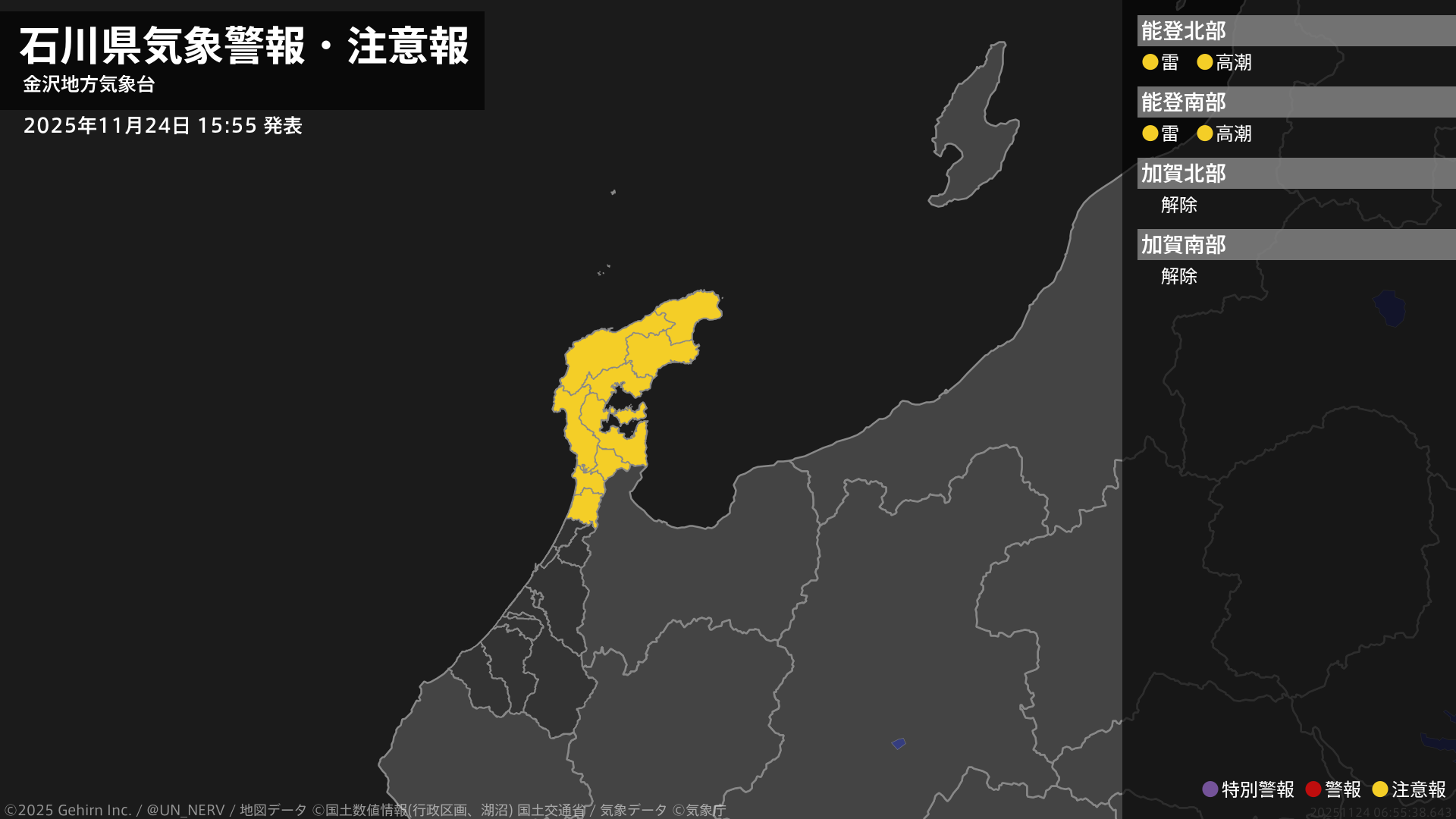 【石川県 気象警報・注意報 2025年11月24日 15:55】能登では、24日夜遅くから25日朝まで高潮に、24日夜遅くまで急な強い雨や落雷に注意してください。#気象警報注意報 #石川県