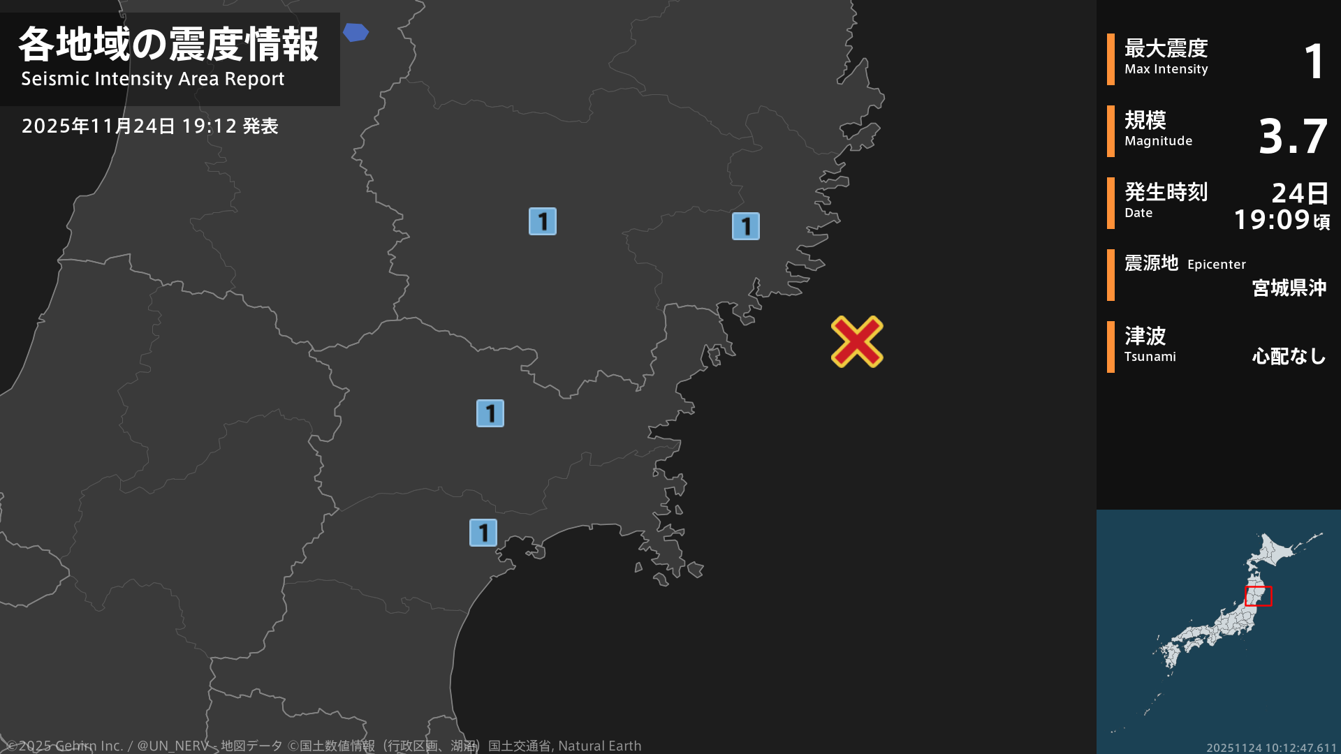 【地震情報 2025年11月24日】19時9分頃、宮城県沖を震源とする地震がありました。震源の深さは約50km、地震の規模はM3.7、最大震度1を岩手県、宮城県で観測しています。この地震による津波の心配はありません。#地震 #岩手県 #宮城県