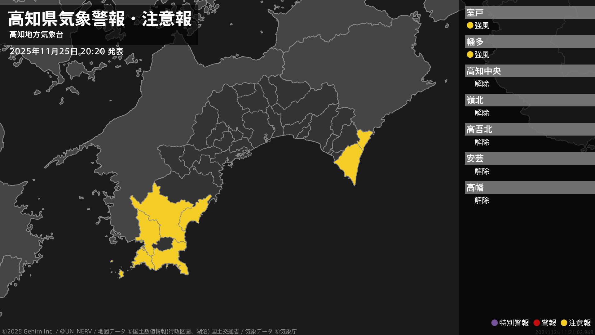 【高知県 気象警報・注意報 2025年11月25日 20:21】