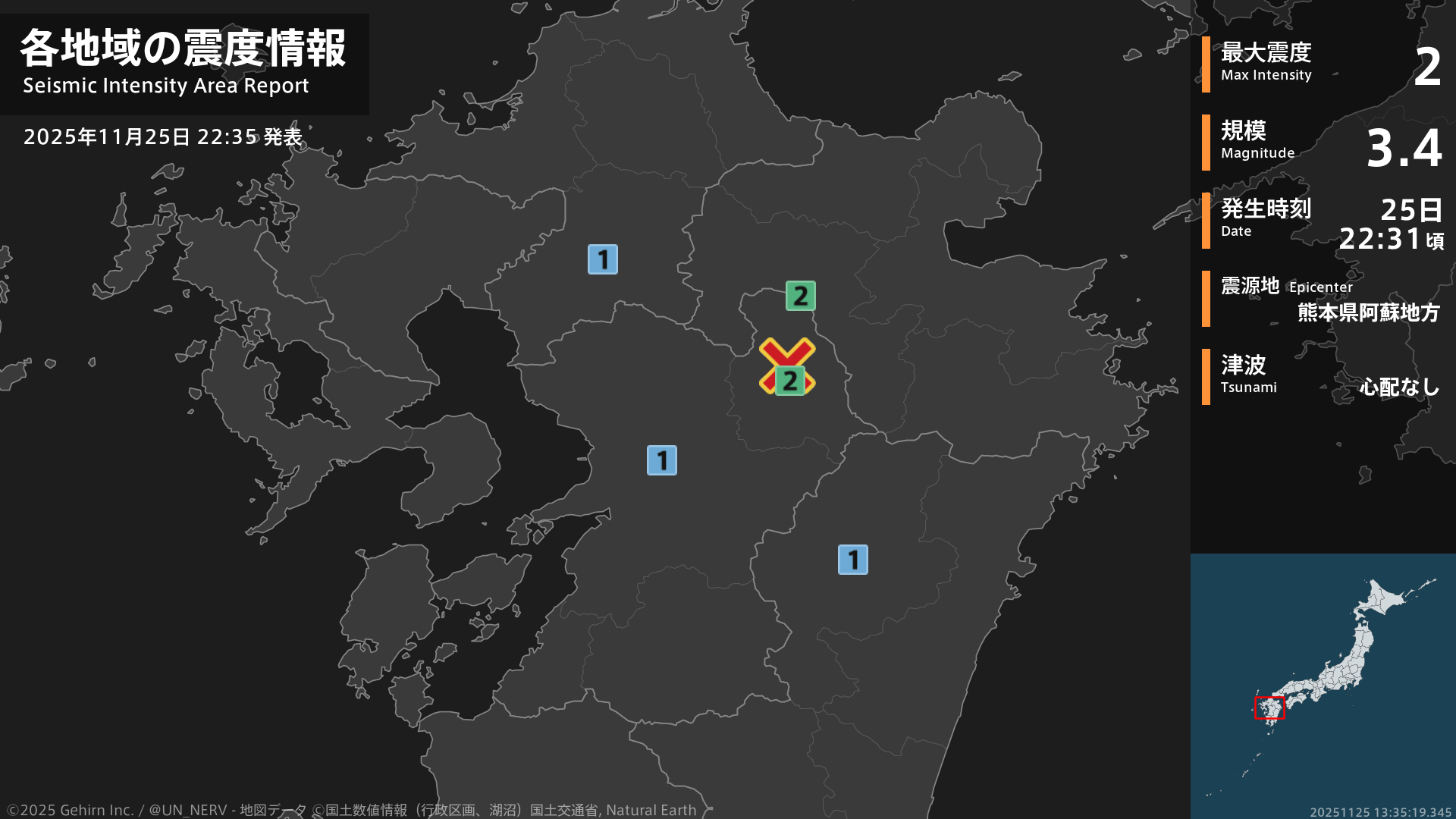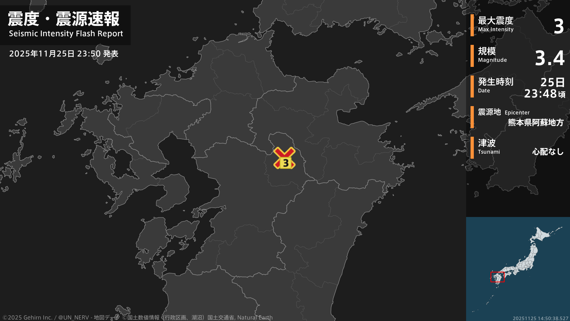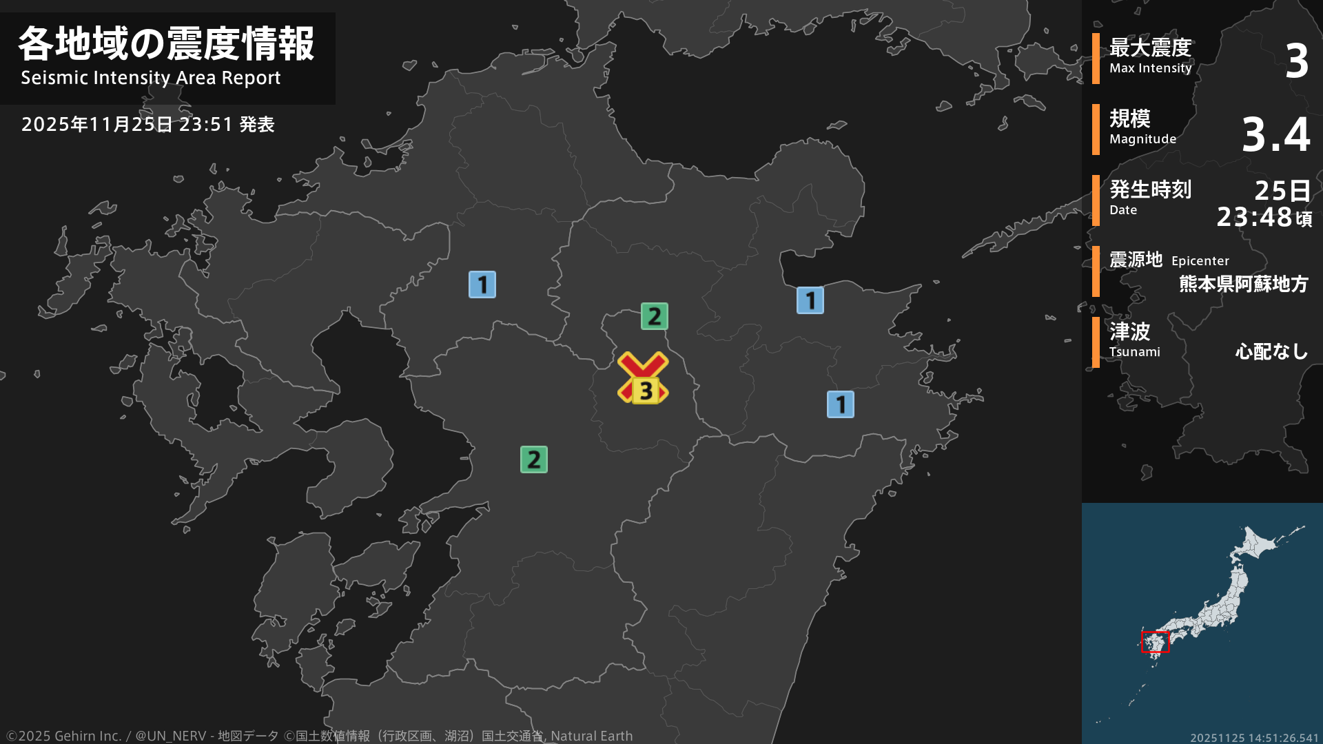 23時48分頃、熊本県阿蘇地方を震源とする地震がありました。地震の規模はM3.4程度、最大震度3程度と推定されています。この情報は気象庁の予報に基づく推定です。情報は誤差を含む場合があります。