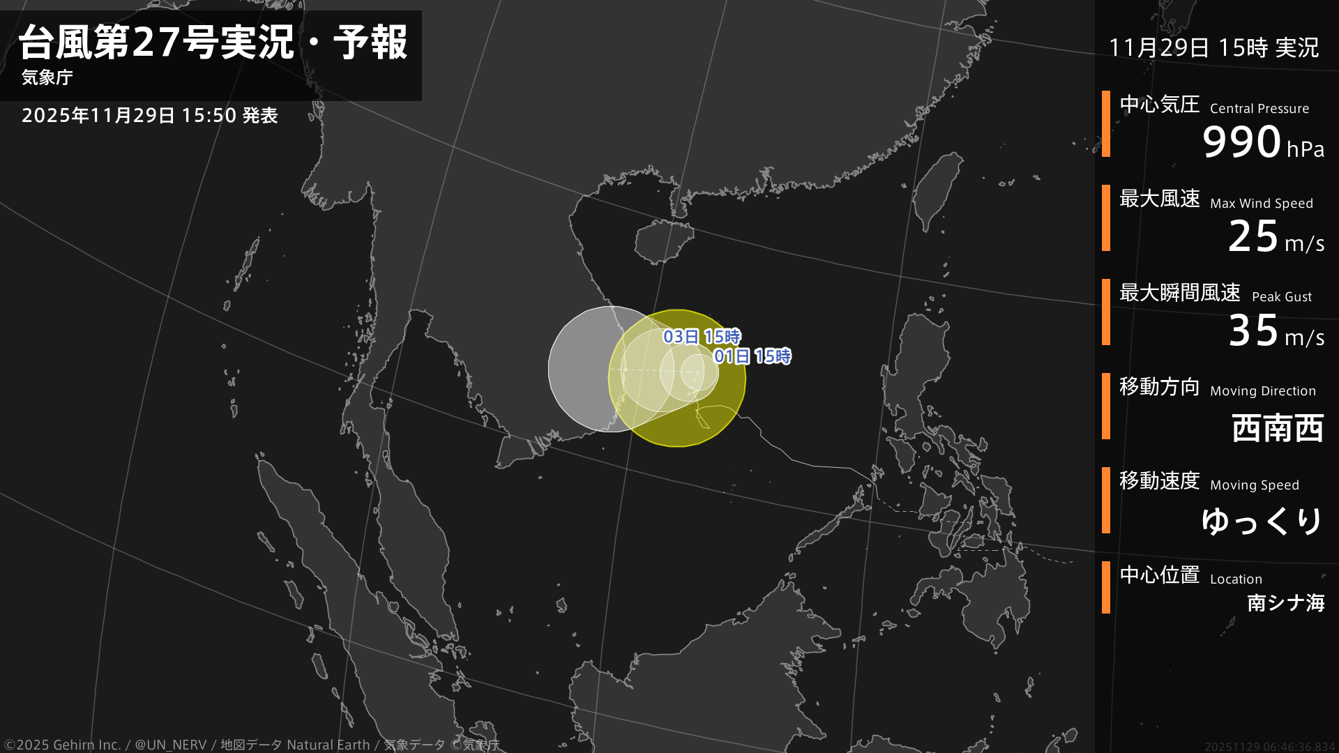 【台風第27号実況・予報 2025年11月29日 15:46】台風第27号(コト)は、南シナ海をゆっくりと西南西に進んでいます。#台風情報