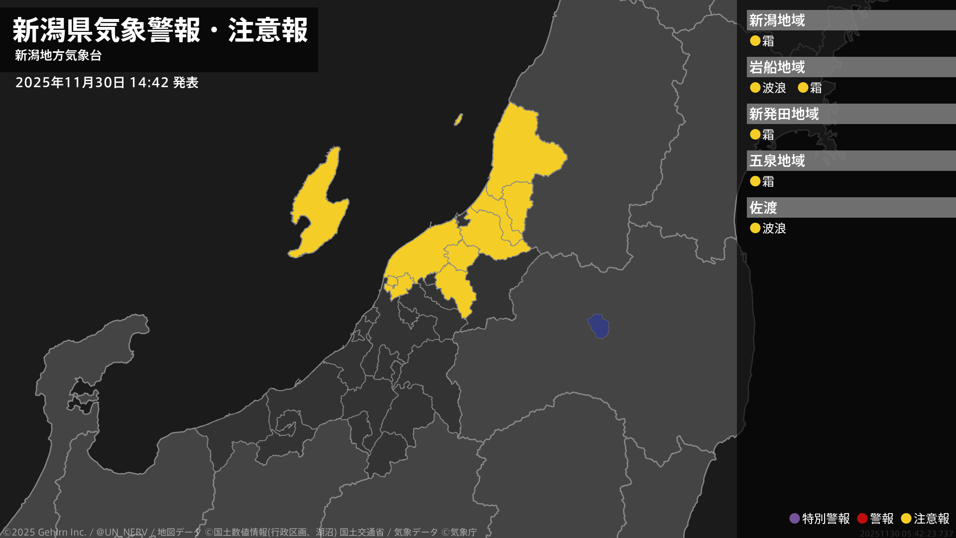 【新潟県 気象警報・注意報 2025年11月30日 14:42】下越、佐渡では、30日夕方まで高波に注意してください。下越では、1日朝は霜に対する農作物の管理に注意してください。#気象警報注意報 #新潟県