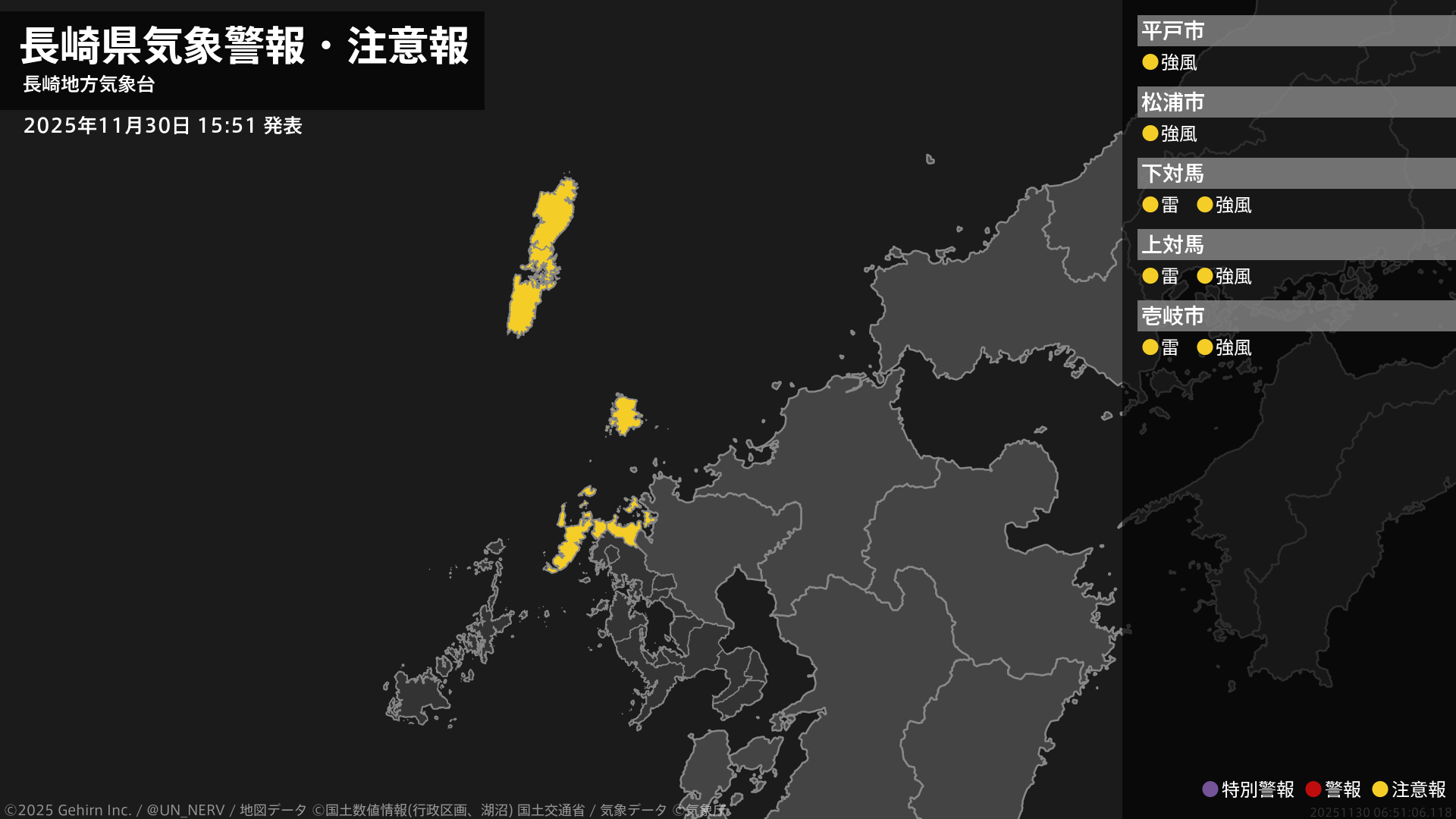 【長崎県 気象警報・注意報 2025年11月30日 15:51】北部、壱岐・対馬では、1日朝まで強風に注意してください。壱岐・対馬では、30日夜遅くから1日朝まで急な強い雨や落雷に注意してください。#気象警報注意報 #長崎県