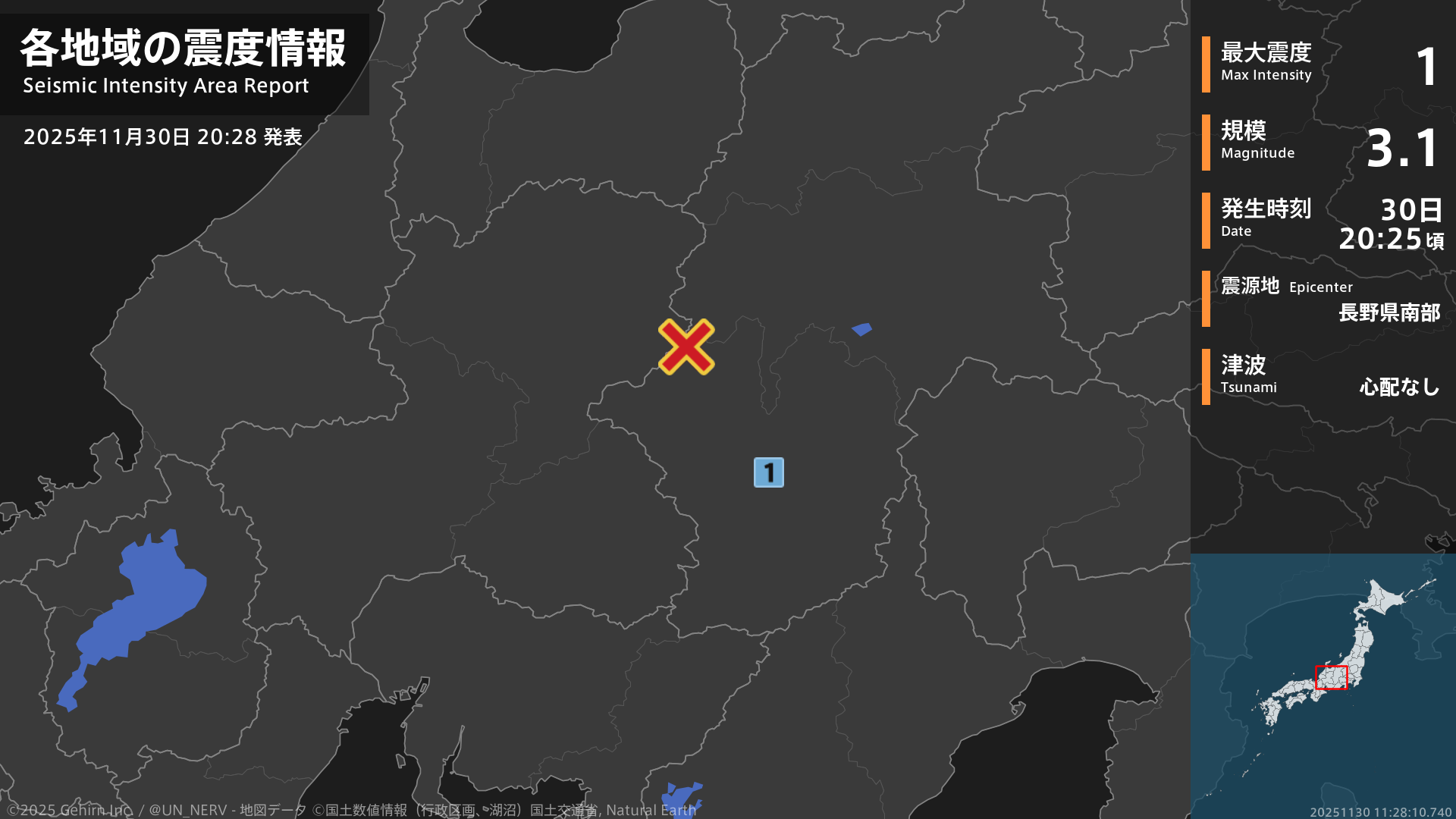 20時25分頃、長野県南部を震源とする地震がありました。震源の深さは約10km、地震の規模はM3.1、最大震度1を長野県で観測しています。この地震による津波の心配はありません。