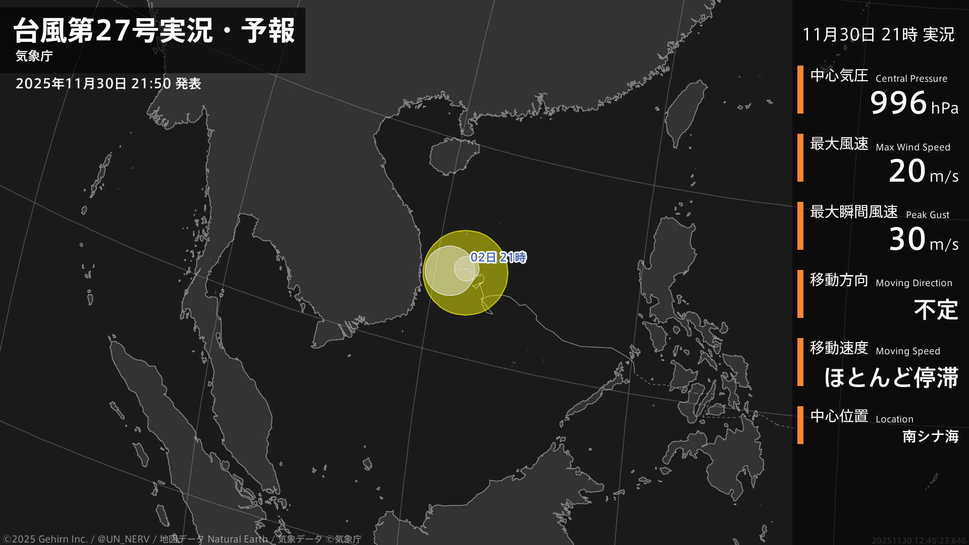 【台風第27号実況・予報 2025年11月30日 21:45】