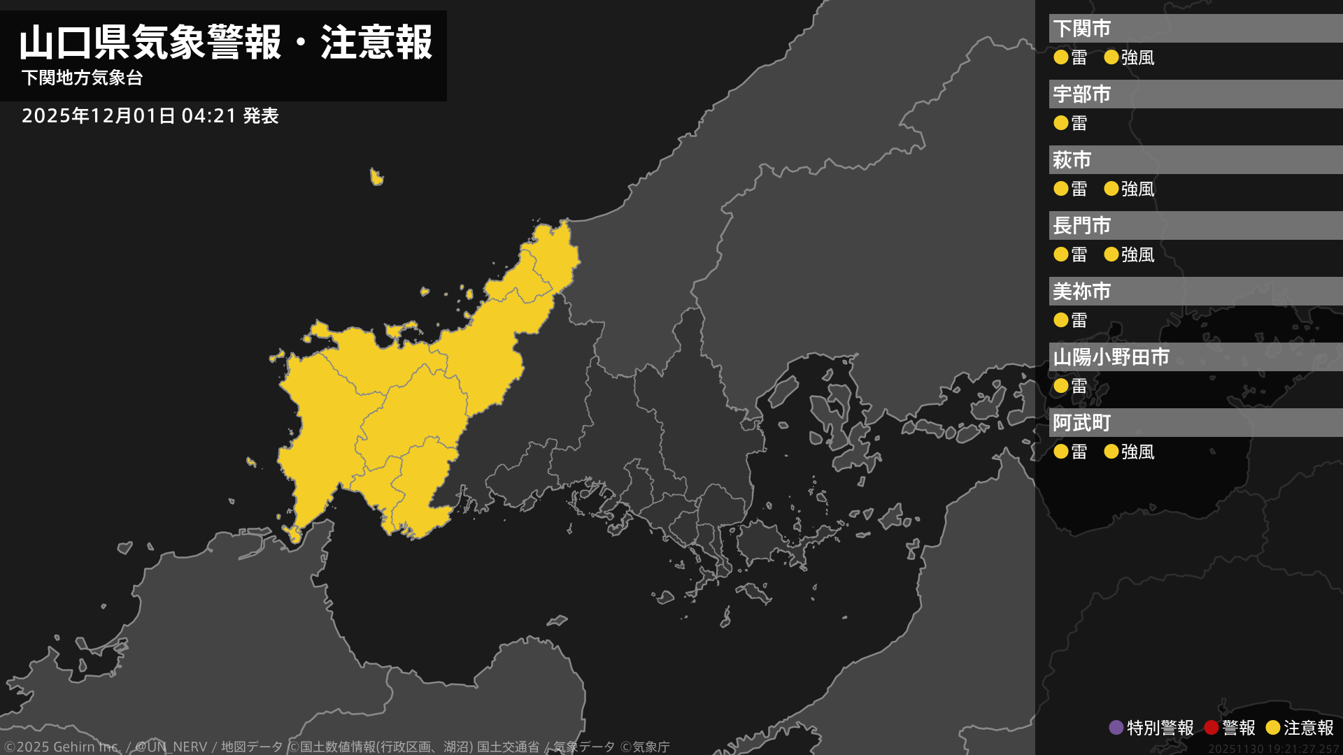 【山口県 気象警報・注意報 2025年12月01日 04:21】