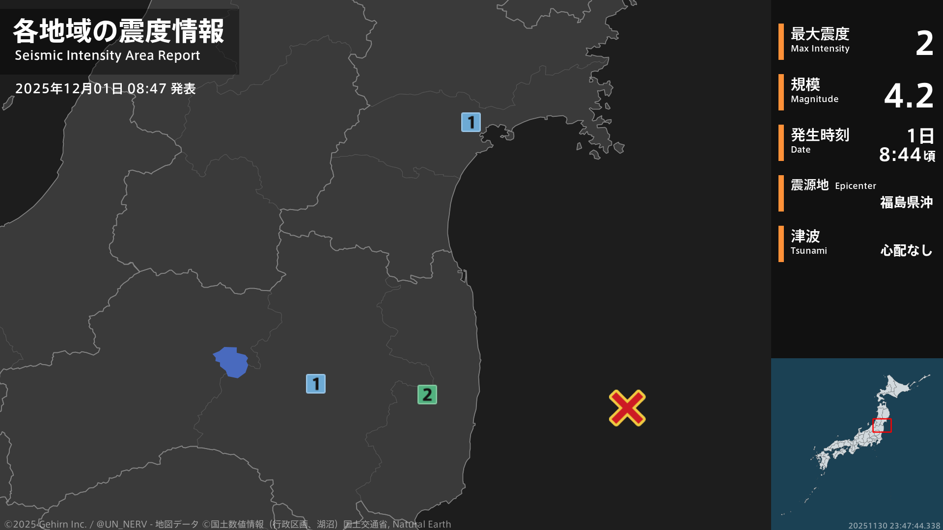 8時44分頃、福島県沖を震源とする地震がありました。震源の深さは約40km、地震の規模はM4.2、最大震度2を福島県で観測しています。この地震による津波の心配はありません。