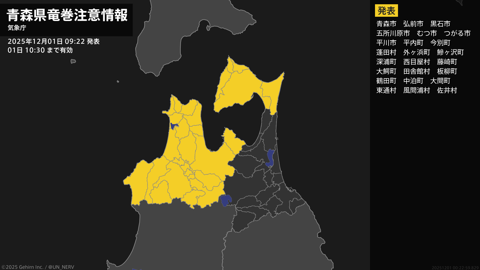 青森県は、竜巻などの激しい突風が発生しやすい気象状況になっています。頑丈な建物内に移動するなど安全確保に努めてください。この情報は01日10:30まで有効です。