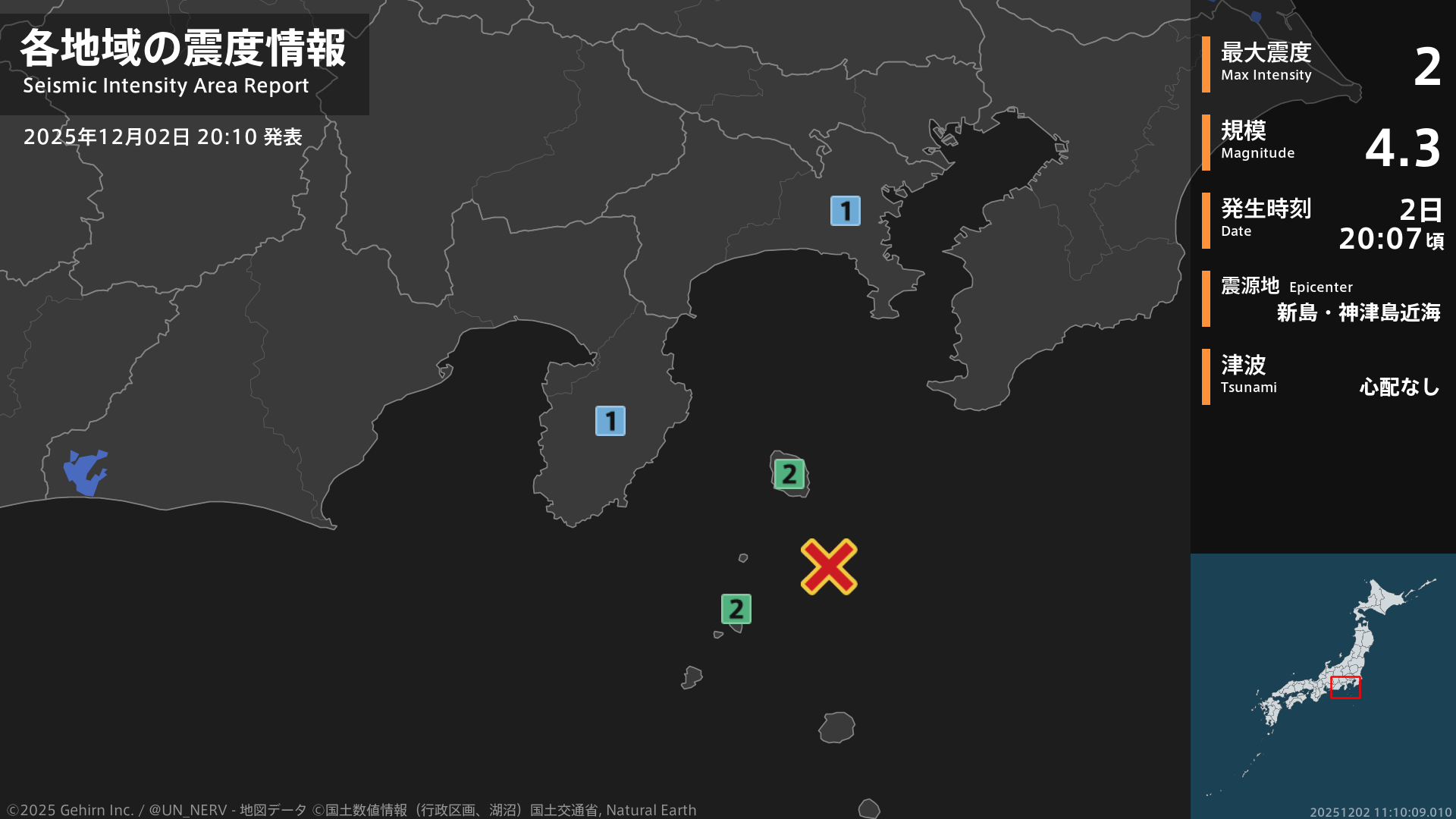20時7分頃、新島・神津島近海を震源とする地震がありました。地震の規模はM4.2程度、最大震度2程度と推定されています。この情報は気象庁の予報に基づく推定です。情報は誤差を含む場合があります。