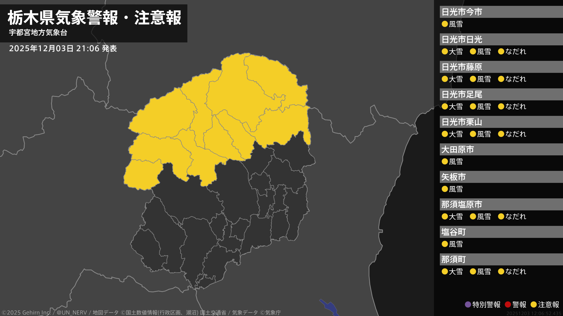 【栃木県 気象警報・注意報 2025年12月03日 21:06】