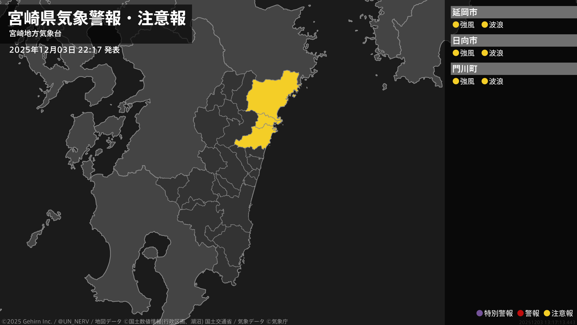 【宮崎県 気象警報・注意報 2025年12月03日 22:17】北部平野部では、4日明け方まで強風や高波に注意してください。#気象警報注意報 #宮崎県