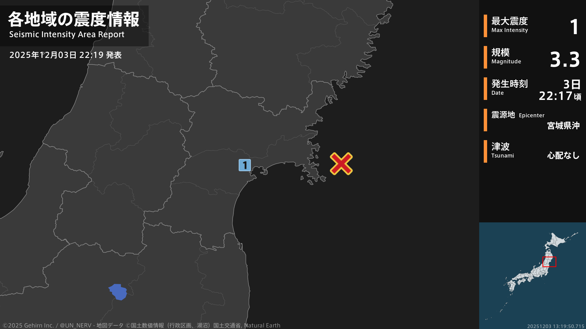 【地震情報 2025年12月3日】22時17分頃、宮城県沖を震源とする地震がありました。震源の深さは約60km、地震の規模はM3.3、最大震度1を宮城県で観測しています。この地震による津波の心配はありません。#地震 #宮城県