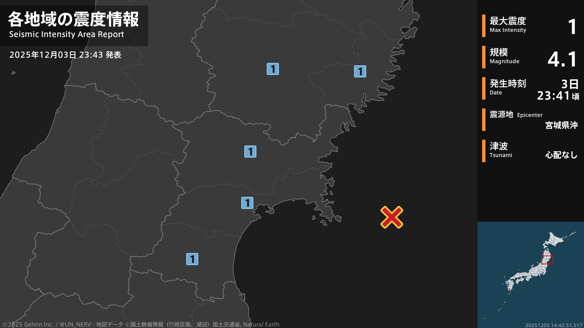 【地震情報 2025年12月3日】23時41分頃、宮城県沖を震源とする地震がありました。震源の深さは約50km、地震の規模はM4.1、最大震度1を岩手県、宮城県で観測しています。この地震による津波の心配はありません。#地震 #岩手県 #宮城県