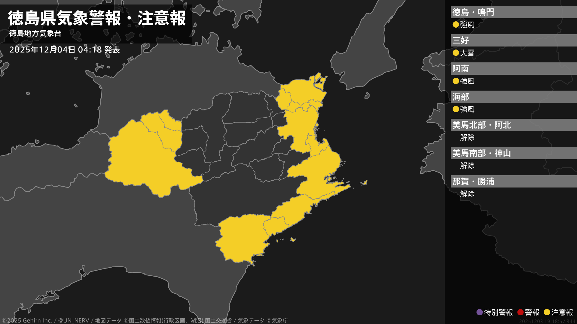 【徳島県 気象警報・注意報 2025年12月04日 04:18】徳島県では、4日昼前まで強風に注意してください。北部では、4日明け方まで大雪に注意してください。#気象警報注意報 #徳島県