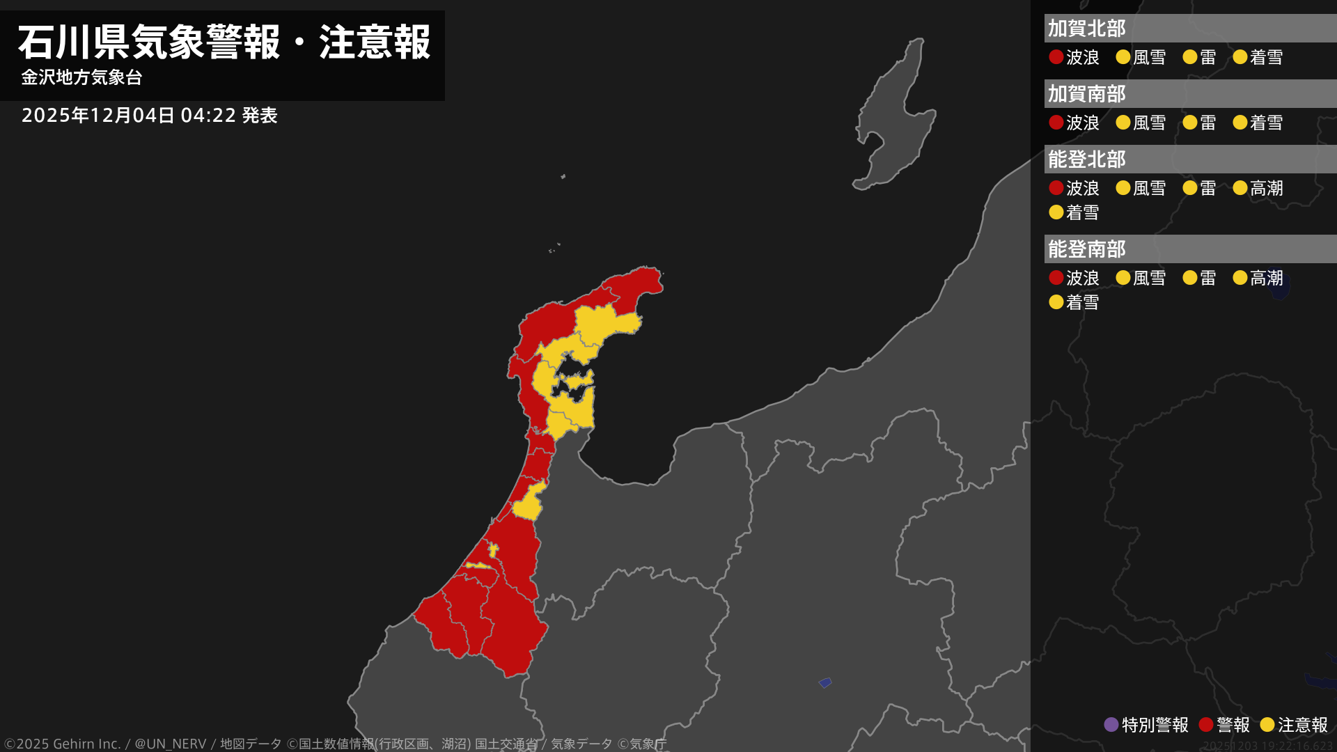 【石川県 気象警報・注意報 2025年12月04日 04:22】石川県では、4日昼過ぎまで高波に警戒してください。#気象警報注意報 #石川県