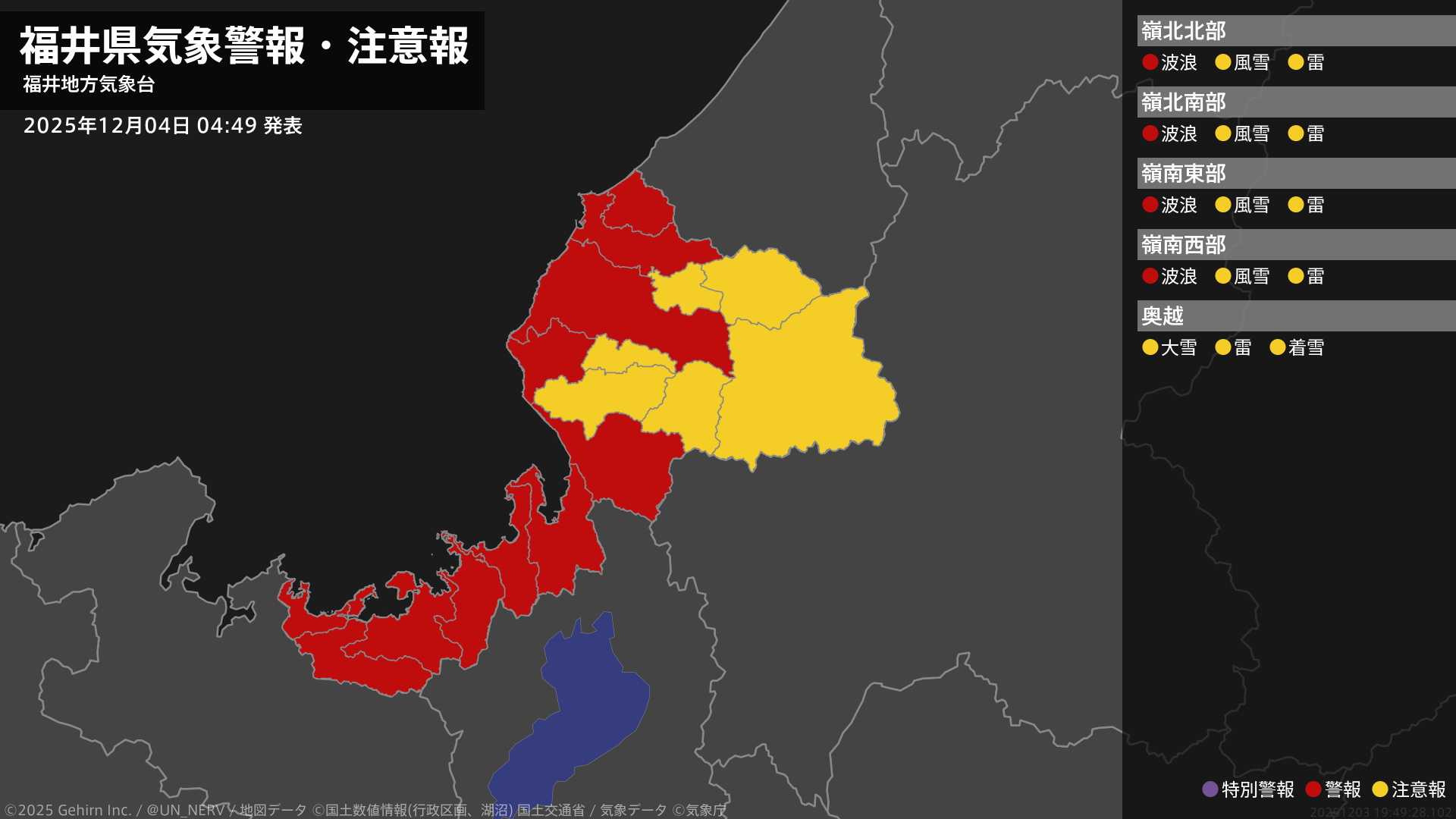 【福井県 気象警報・注意報 2025年12月04日 04:49】福井県では、4日昼前まで高波に警戒してください。#気象警報注意報 #福井県