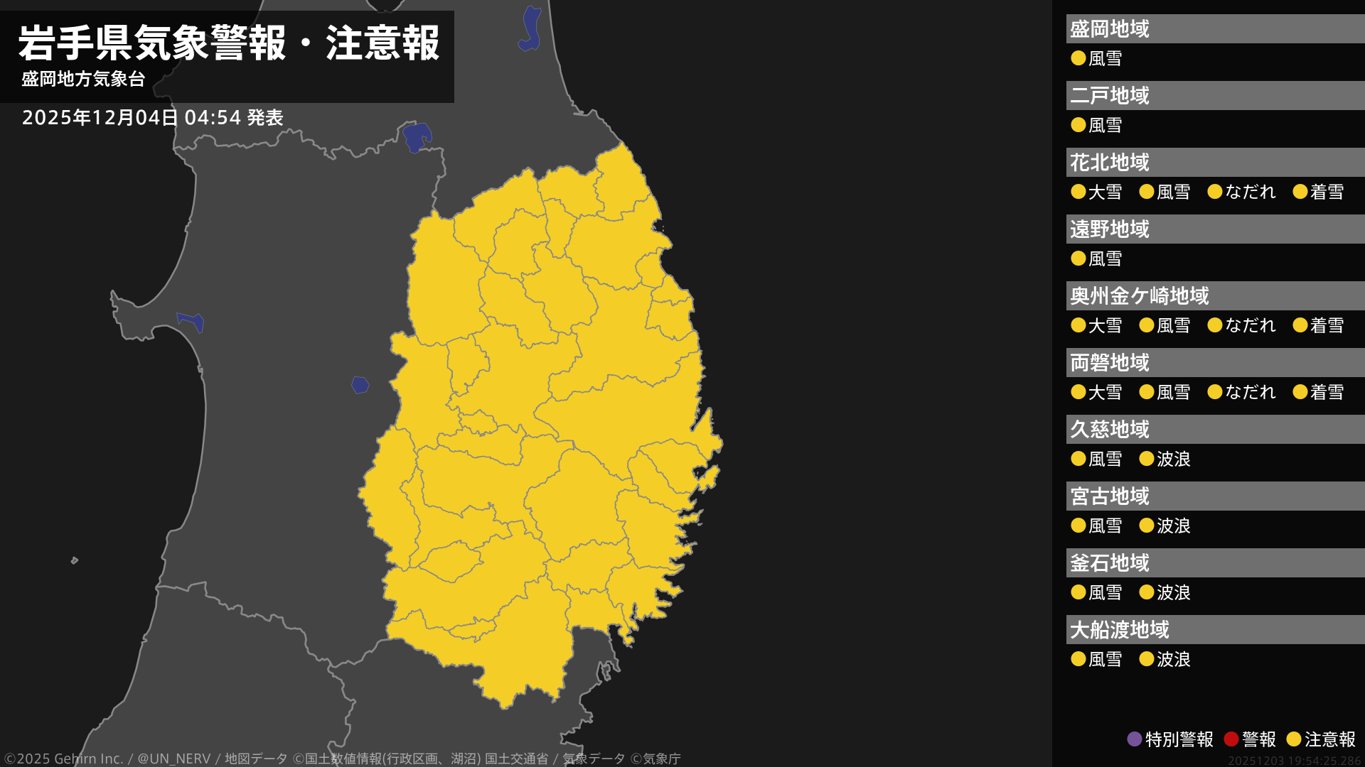 【岩手県 気象警報・注意報 2025年12月04日 04:54】岩手県では、4日夕方まで風雪や高波に注意してください。内陸では、4日朝から4日夕方まで大雪や電線等への着雪に、5日までなだれに注意してください。#気象警報注意報 #岩手県