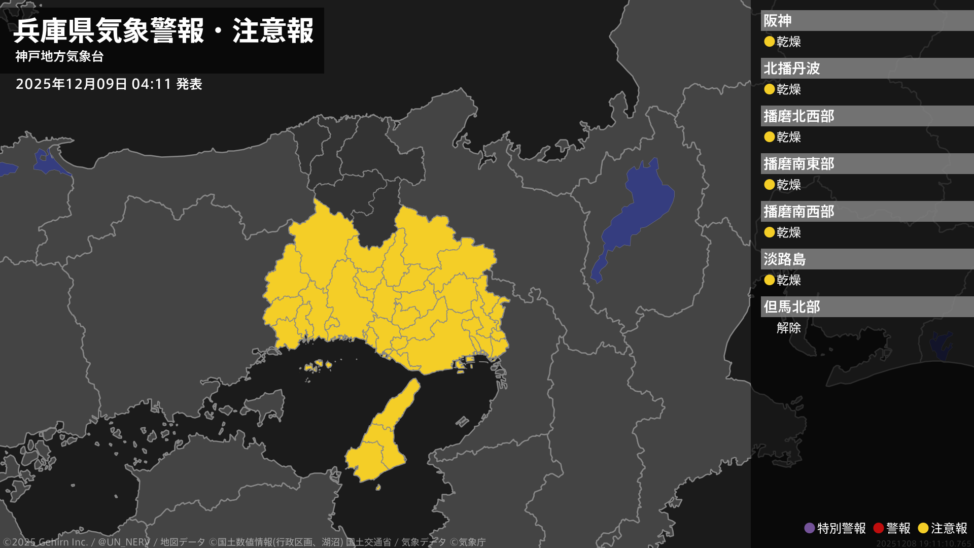 【兵庫県 気象警報・注意報 2025年12月09日 04:11】南部では、10日まで空気の乾燥した状態が続くため、火の取り扱いに注意してください。#気象警報注意報 #兵庫県