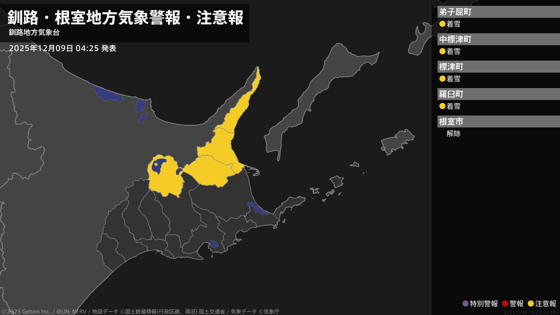 【釧路・根室地方 気象警報・注意報 2025年12月09日 04:25】根室、釧路地方では、9日昼前まで電線等への着雪に注意してください。#気象警報注意報 #根室地方 #釧路地方