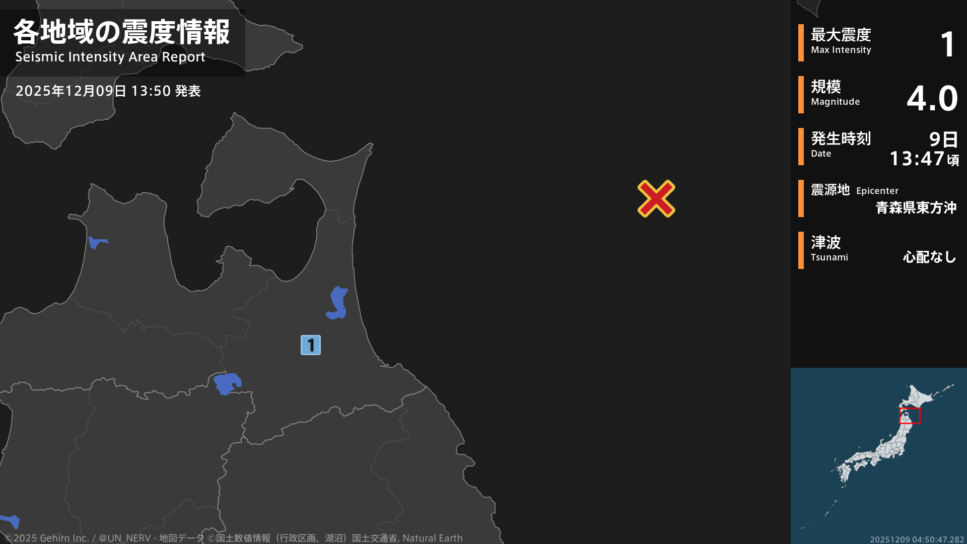 【地震情報 2025年12月9日】13時47分頃、青森県東方沖を震源とする地震がありました。震源の深さは約40km、地震の規模はM4.0、最大震度1を青森県で観測しています。この地震による津波の心配はありません。#地震 #青森県