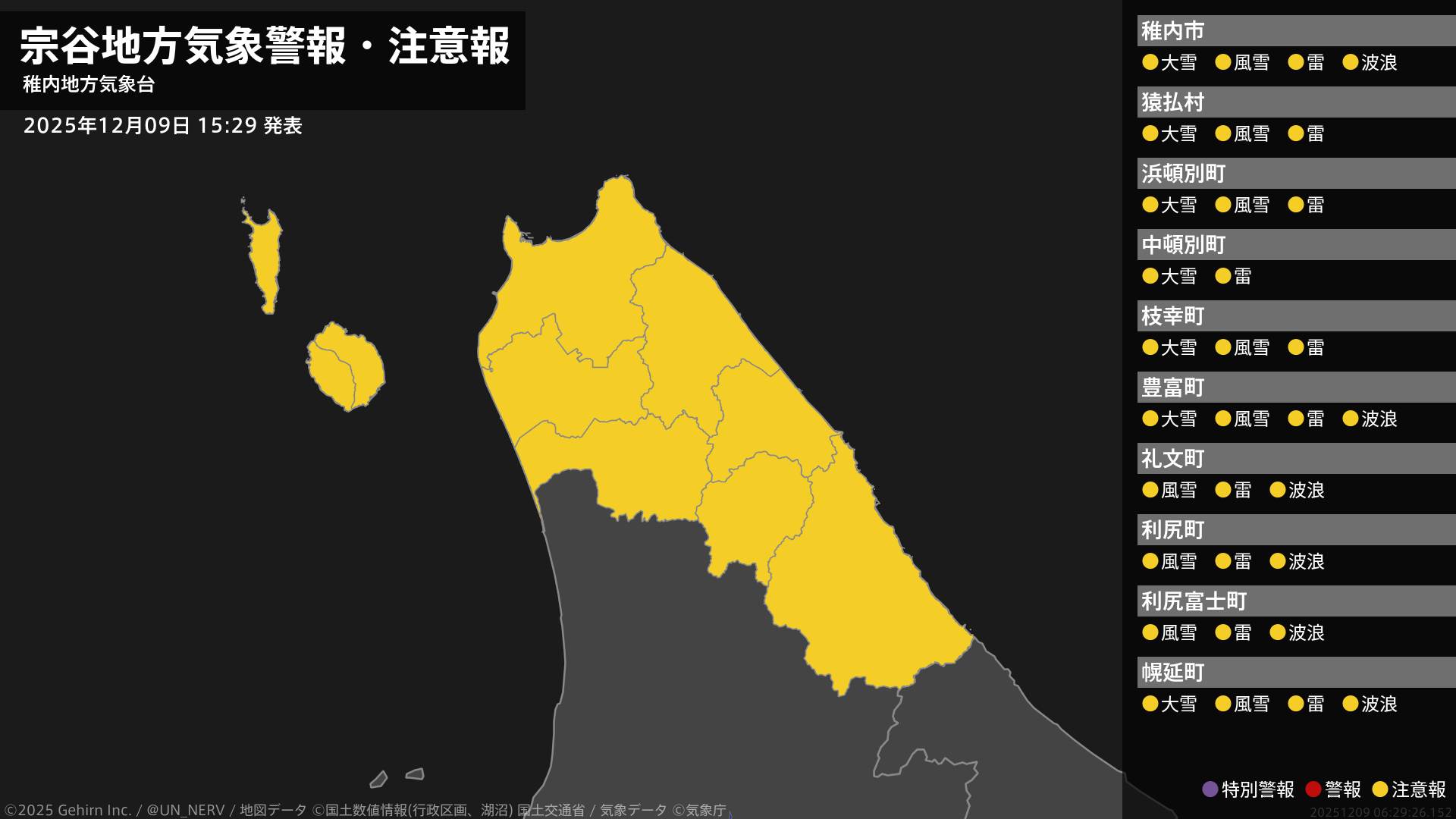 【宗谷地方 気象警報・注意報 2025年12月09日 15:29】宗谷地方では、風雪や大雪、高波、落雷に注意してください。#気象警報注意報 #宗谷地方