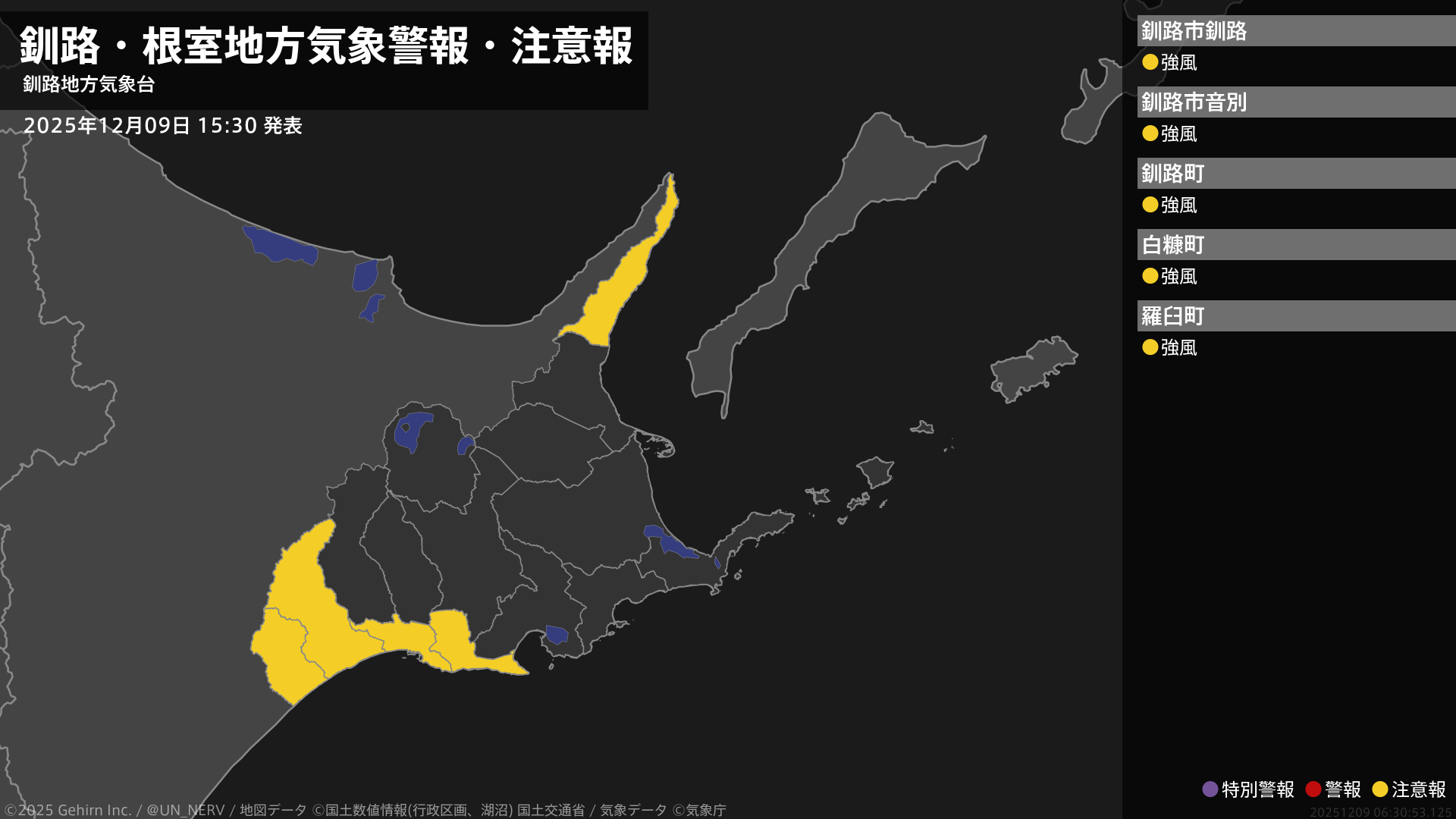 【釧路・根室地方 気象警報・注意報 2025年12月09日 15:30】釧路地方では9日夜遅くまで、根室地方では9日夜遅くから10日昼前まで、強風に注意してください。#気象警報注意報 #根室地方 #釧路地方