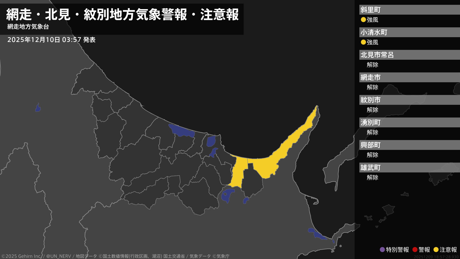 【網走・北見・紋別地方 気象警報・注意報 2025年12月10日 03:57】