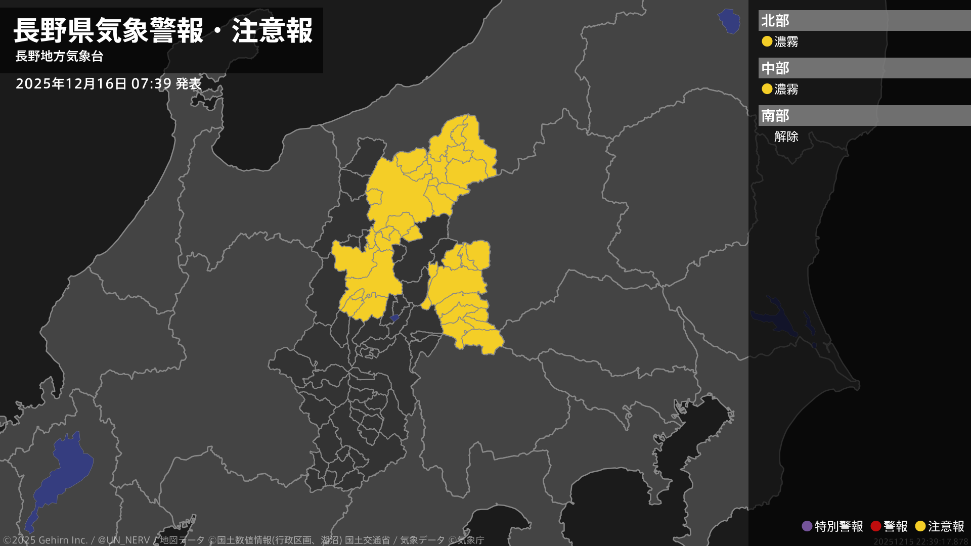 【長野県 気象警報・注意報 2025年12月16日 07:39】北部、中部では、16日昼前まで濃霧による視程障害に注意してください。#気象警報注意報 #長野県